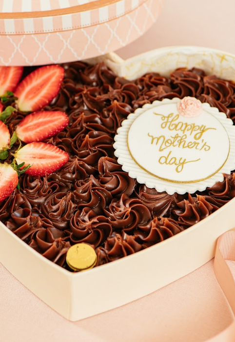 Brownie de chocolate em formato de coração, finalizado com brigadeiro preto. Acompanha placa decorativa “Happy Mothers Day”.