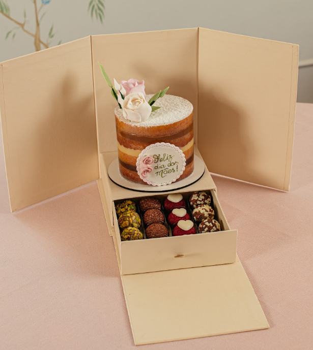 Naked Cake PP: Massa de baunilha com recheio de brigadeiro preto, brigadeiro branco e doce de leite.