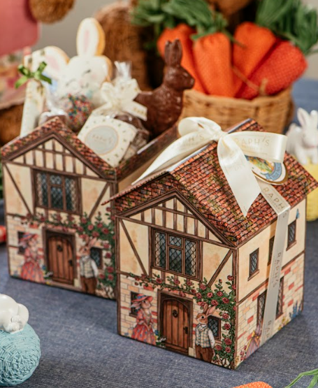 01 Coelho de chocolate ao leite crocante (≈ 60g), 01 biscoitos amanteigados com glace real