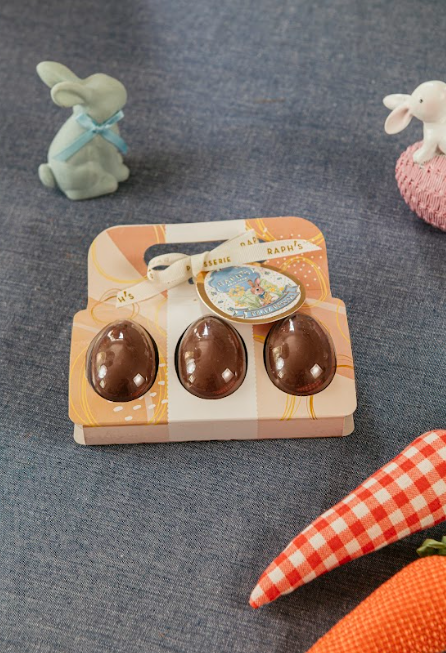 Embalagem exclusiva com 03 ovos de chocolate recheados com brigadeiro preto, brigadeiro branco e doce de leite.
