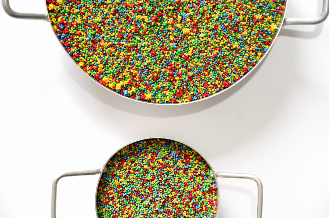 Panelinha de brigadeiro preto com dragês coloridos.