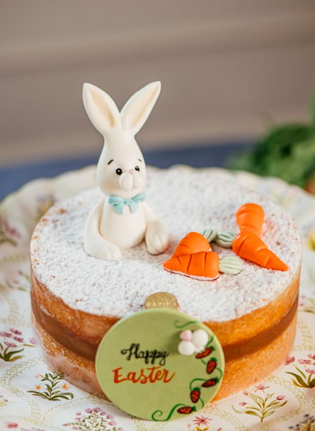 Massa de baunilha com recheio de doce de leite, finalizada com decoração de Páscoa.